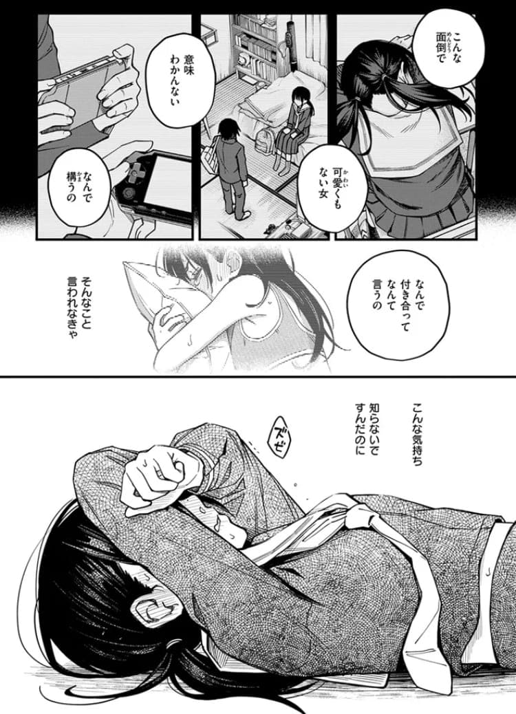 この作品の素晴らしいところは、単純なエロ漫画で終わらせていないところですね。天野の自己肯定感の低さから来る突っ張った態度や、上村のうじうじした性格など、キャラクターの心理描写がとても丁寧に描かれています。特に感情がぐちゃぐちゃになって泣き出す天野の描写は、複雑な乙女心がよく表現されていて感情移入しやすかったです。ストーリーをきちんと読ませてくれる作品で、最後まで一気に読んでしまいました。続編も期待したいです。